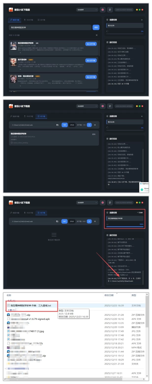 一个现代化、高效的番茄小说下载器,使用 Python 构建,配备简洁、响应式的网页界面。功能特性包括图书搜索(轻松按标题或作者搜索图书)、批量下载(一次下载多本图书)、格式支持(导出为 TXT 或 EPUB 格式)、封面图片(自动获取并在 EPUB 文件中嵌入图书封面)以及章节选择(下载完整图书、特定范围或手动选择的章节)。