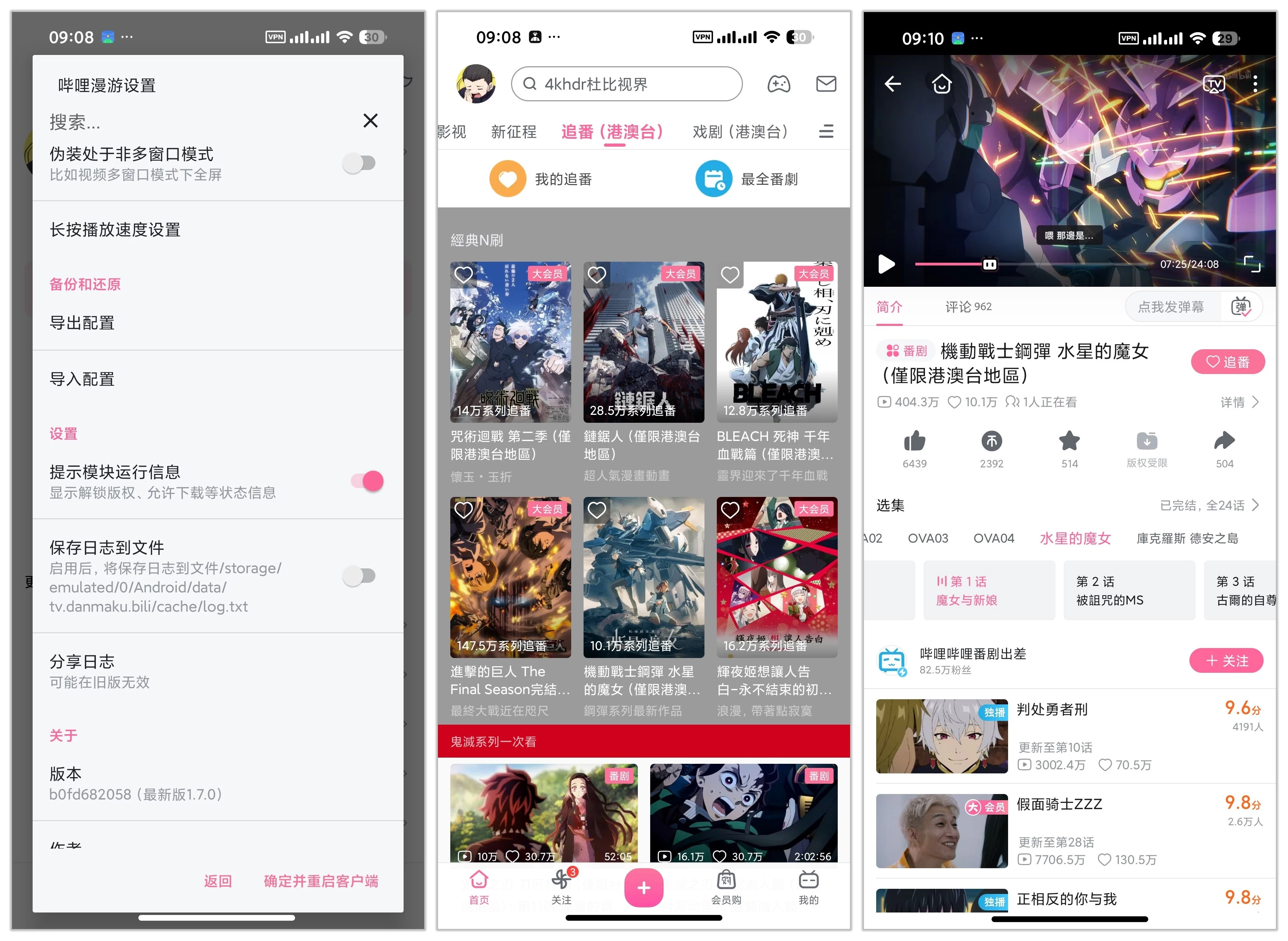同时内置漫游模块,能够解锁番剧地区限制,观看港澳台番剧综艺,还具备去广告功能。