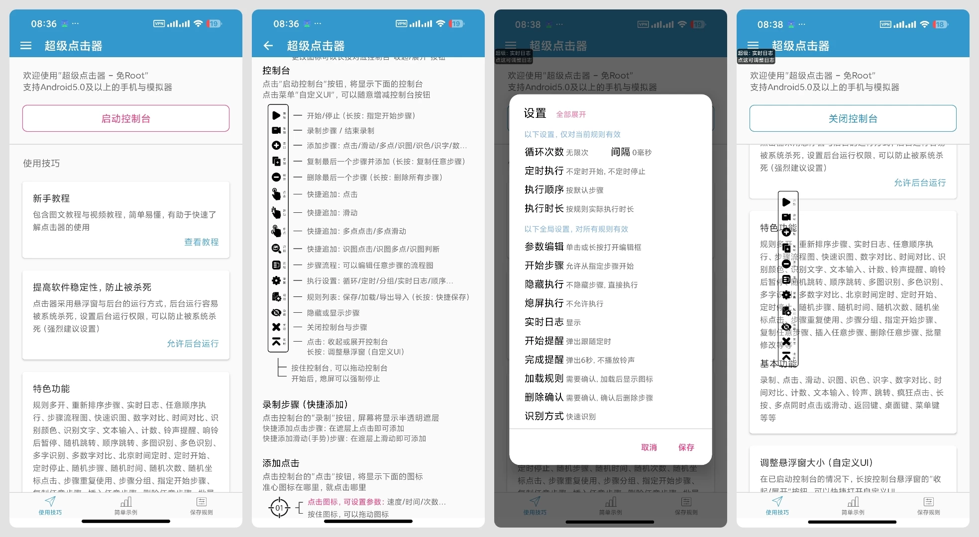超级点击器打破传统自动点击工具限制,实现全场景适配,支持Android 5.0及以上的手机与模拟器运行,无需Root设备,降低使用门槛。其特色功能丰富多样,包括规则多开、重新排序步骤、实时日志、任意顺序执行、步骤流程图、快速识图、数字对比、时间对比、识别颜色、识别文字、文本输入、计数、铃声提醒、响铃后暂停、随机跳转、顺序跳转、多图识别、多色识别、多字识别、多数字对比、北京时间定时、定时开始、定时停止、随机步骤、随机时间、随机次数、随机坐标点击、步骤重复使用、步骤分组、指定开始步骤、复制任意步骤、插入任意步骤、删除任意步骤、批量修改等。基本功能涵盖录制、点击、滑动、识图、识色、识字、数字对比、时间对比、计数、文本输入、铃声、跳转、疯狂点击、长按、多点同时点击或滑动、返回键、桌面键、菜单键等。