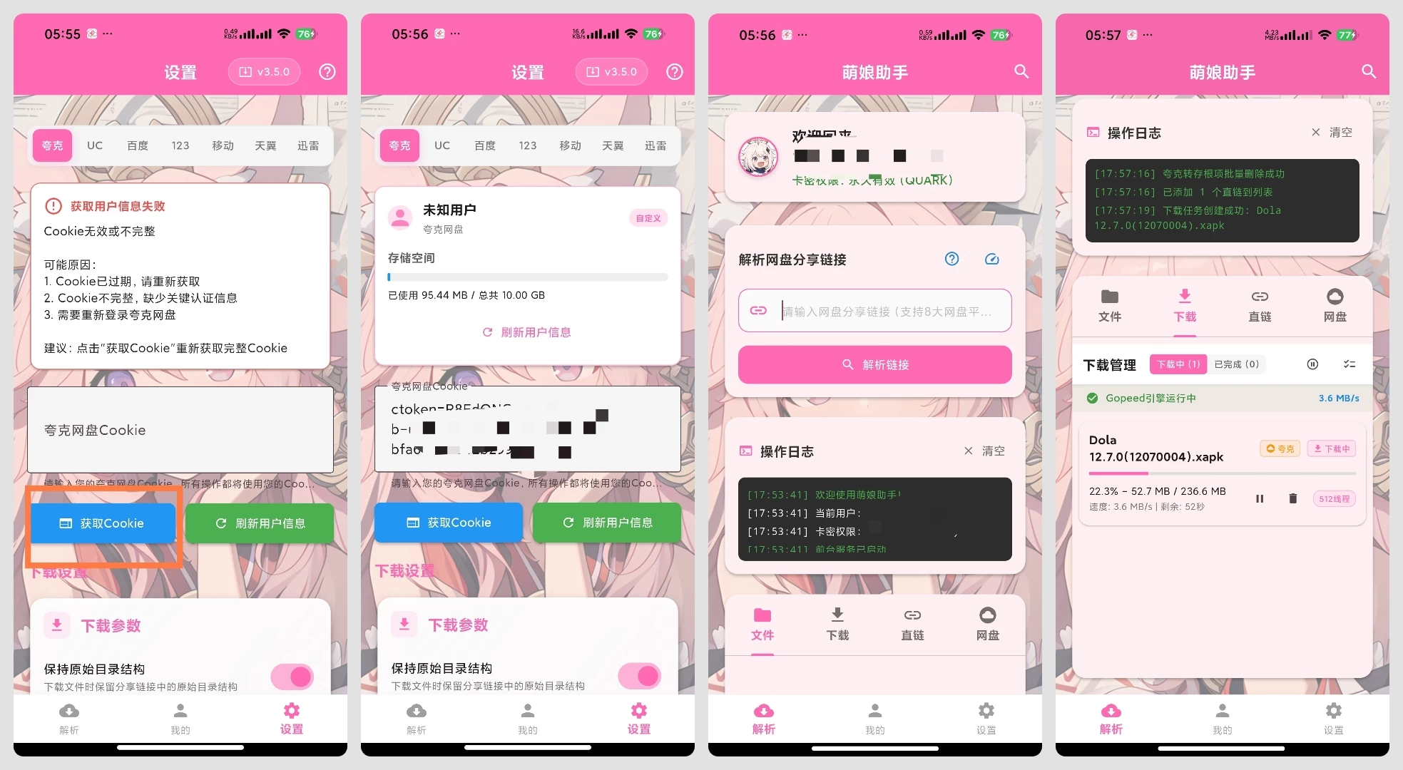 3. 进入软件后,点击右下角设置,再点击获取cookie,此时会进入夸克登录界面,登录账号(若界面小,可点击右下角放大按钮),然后点击获取cookie。